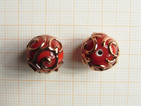 【ランプワーク ビーズ】ボール型・銅色の唐草模様・赤・12mm