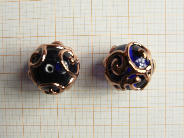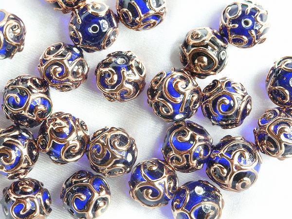 【ランプワーク ビーズ】ボール型・銅色の唐草模様・透明青・12mm