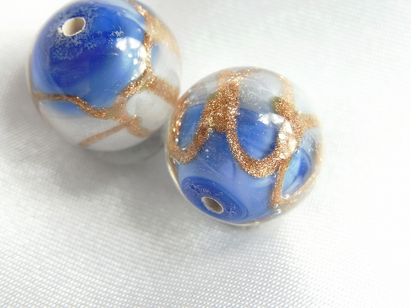 【ランプワーク ビーズ】ボール型・青と白・銅色ラメ12x8mm