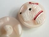 ベースガラスはピンクで、真珠光沢の白で毛並みを、赤で首輪とリボンを描いています。