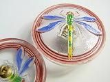 ベースガラスは無色透明で、青緑白黄赤などで蜻蛉を描き、円周を赤で縁取っています。