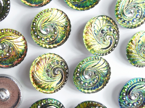 【チェコガラスボタン】模様(渦巻の羽)・虹色・オレンジ緑赤紫と銀・中(2.70cm)